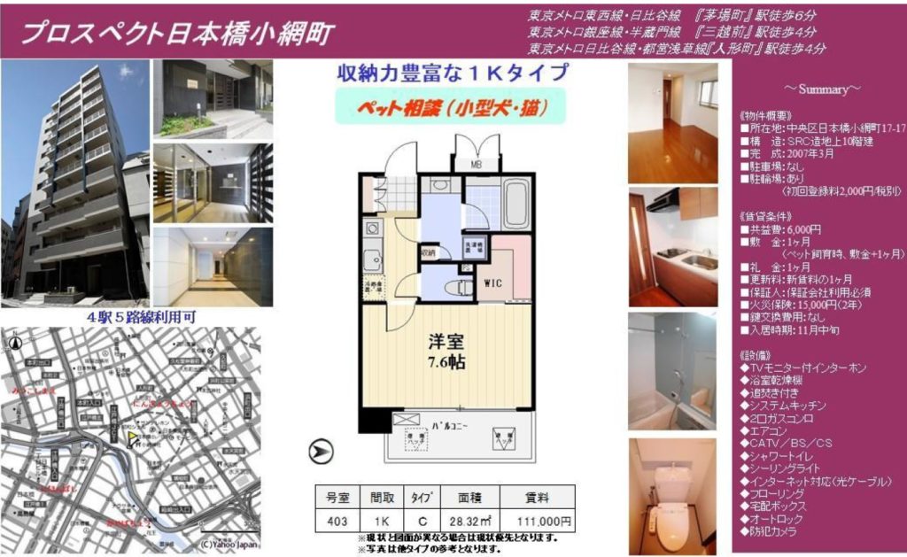 人形町駅、三越前駅共に徒歩4分の立地にあるお部屋。ペット飼育可でこの家賃!ウォークインクローゼットがあるので、洋服もたくさん収納できますね♪柱が出ていないのでお部屋が使いやすいのがいいですね。オススメです。